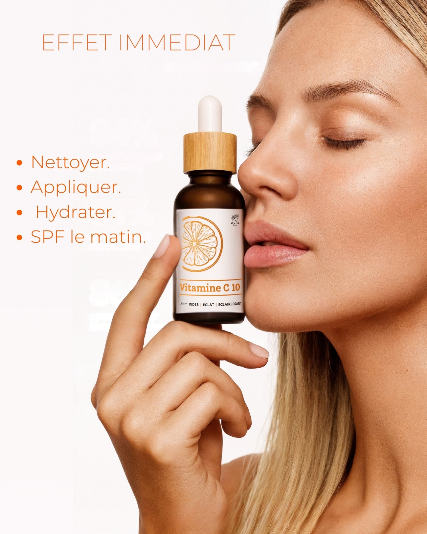 Vitamine C stabilisée (Sodium Ascorbyl Phosphate 10 %) : antioxydant puissant, cible les tâches, redonne de la luminosité et stimule la production de collagène.